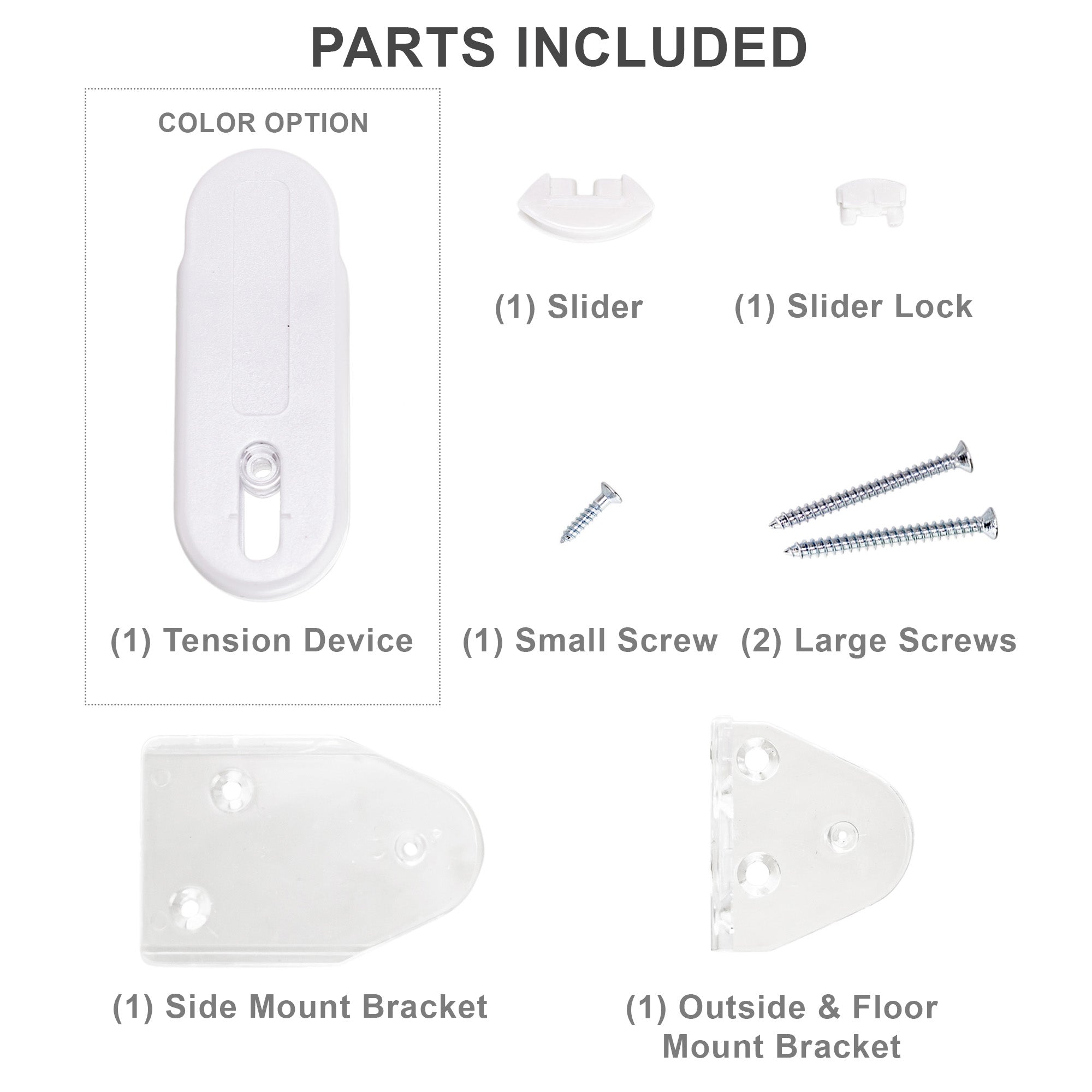 What's Included Tension device, inside mount bracket, outside mount bracket, three screws, and instructions.