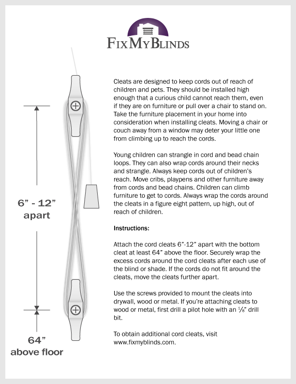 Cleats are designed to keep window covering cords out of the reach of children. They should be installed high enough on the wall that a curious child cannot reach them, even if they are on furniture or pull over a chair to stand on. When installing cleats, take furniture placement into consideration.