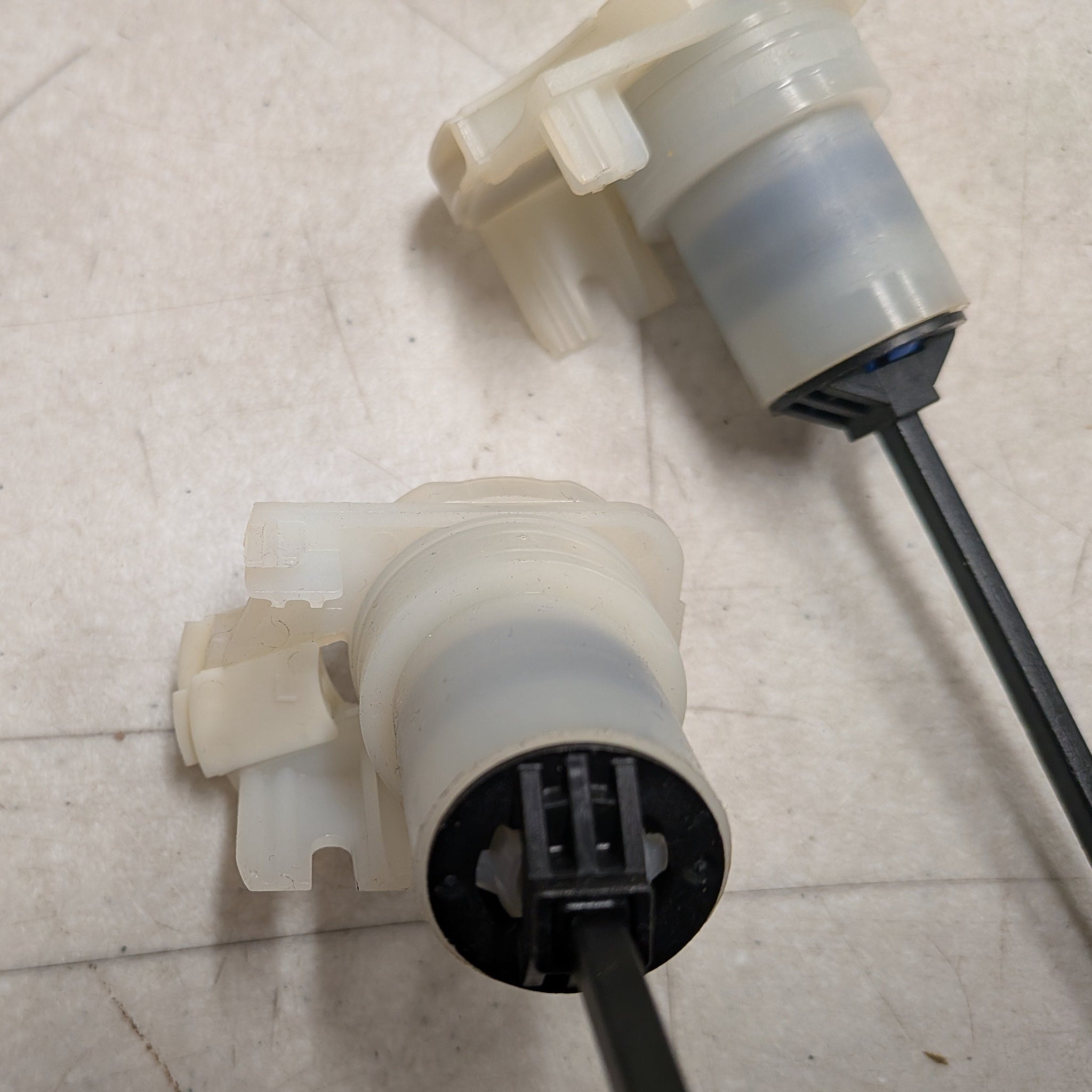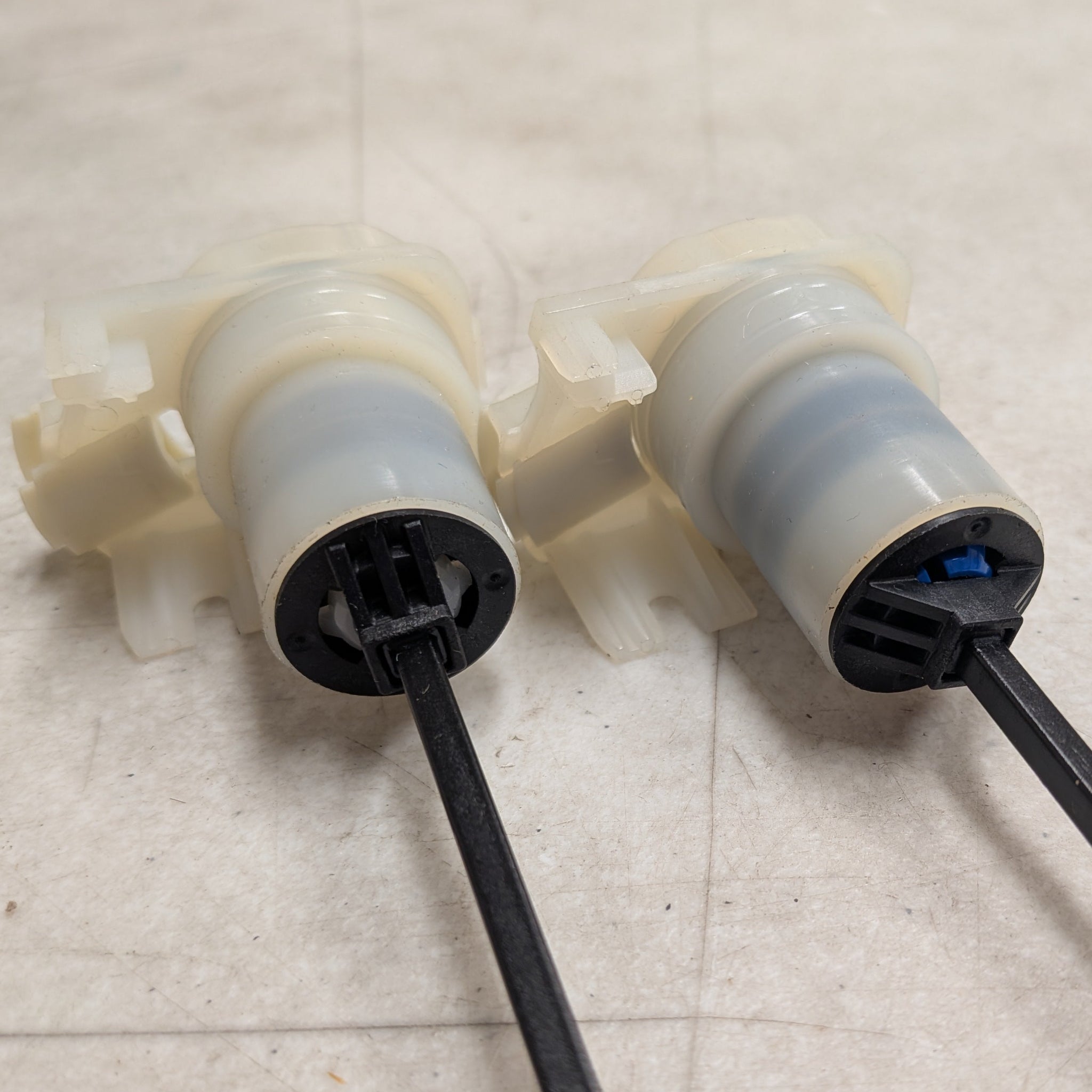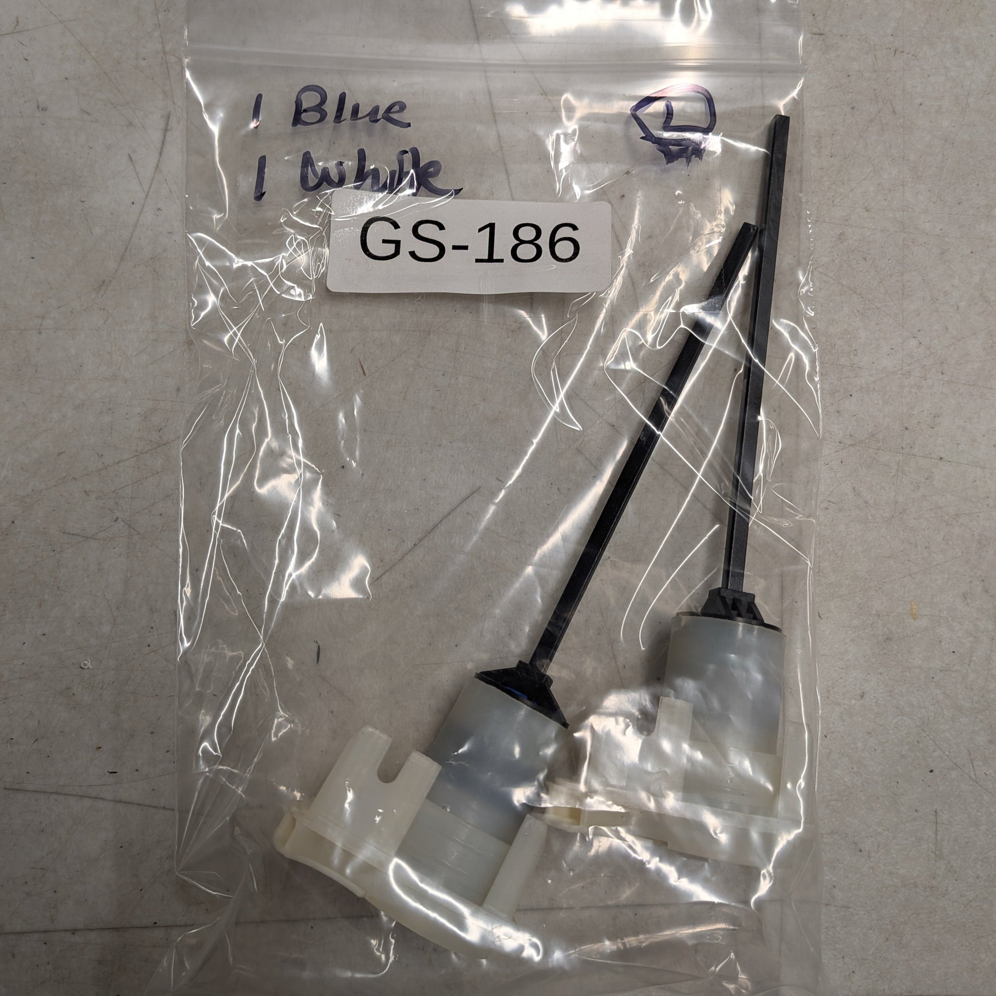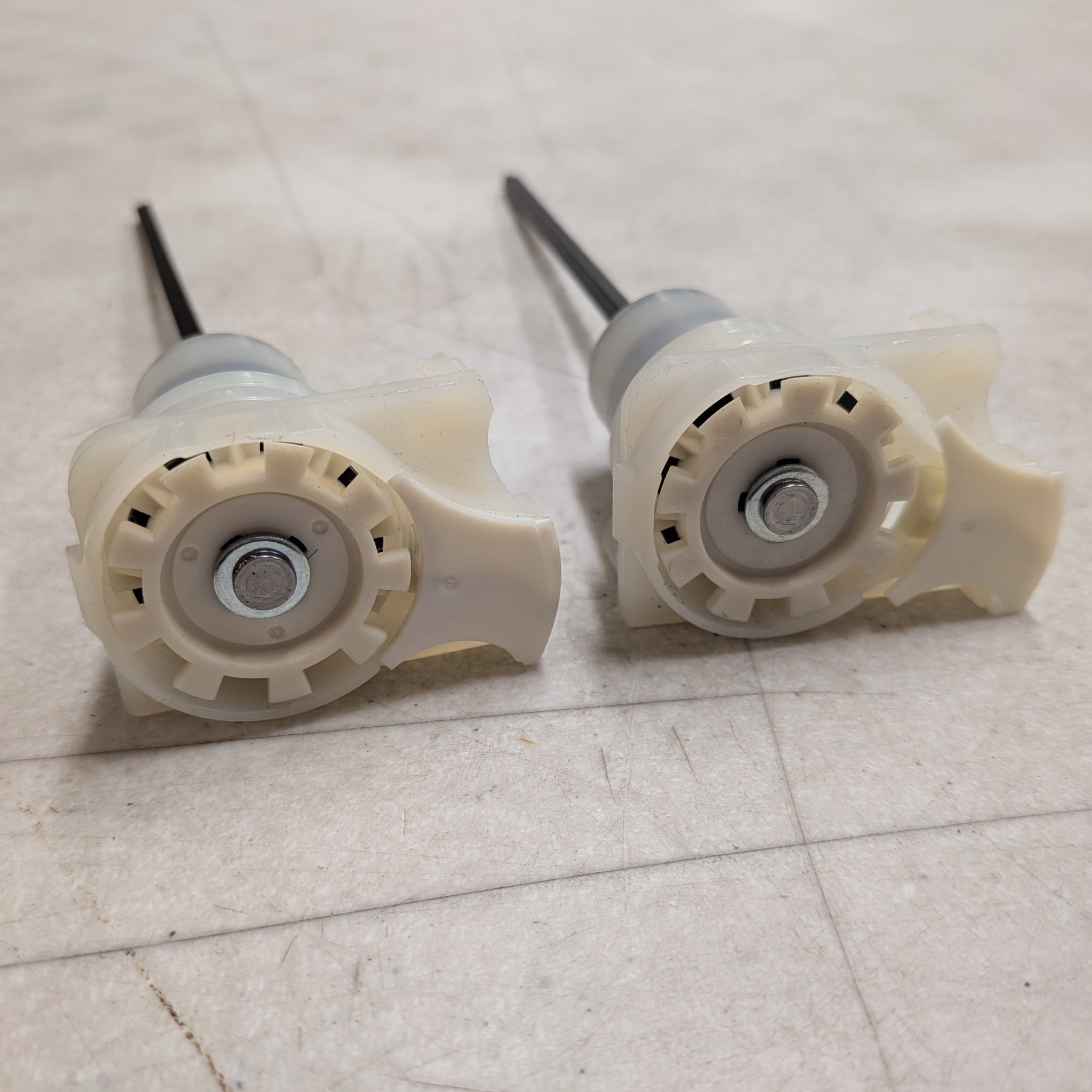 Two left-side clutches for Graber and Bali cellular shades made before 2019. One has a blue gear, and one has a white gear.