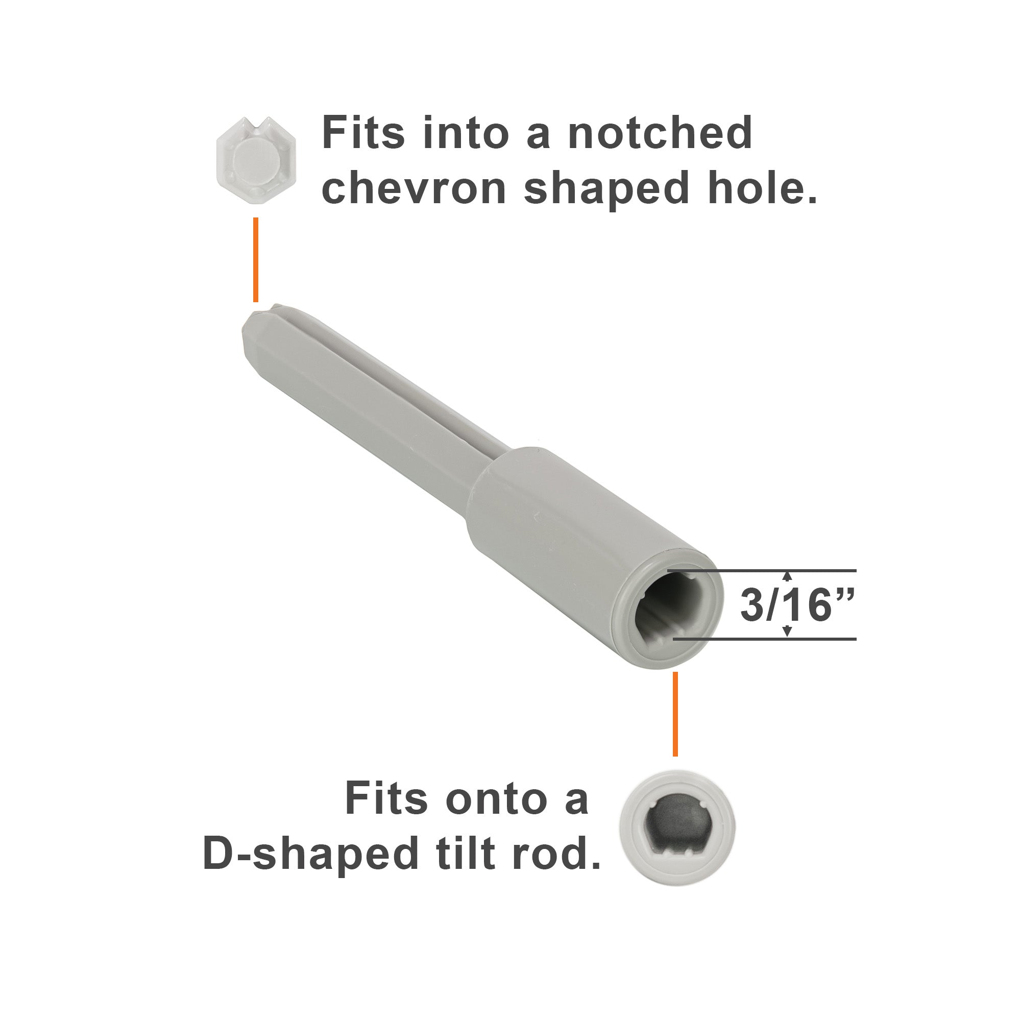 This adapter is used on some 2" and 2 1/2" Hunter Douglas cordless LiteRise Parkland wood and EverWood faux wood blinds. One side accommodates the metal "D" rod, and the other has the notched-chevron shape to fit into the tilt mechanism.